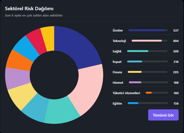 Teknoloji sektörü 458 saldırı ile ikinci sırada. Dijital altyapıların kalbi olan bu sektör, paradoksal bir şekilde en çok hedef alınan alanlardan biri haline gelmiş durumda.