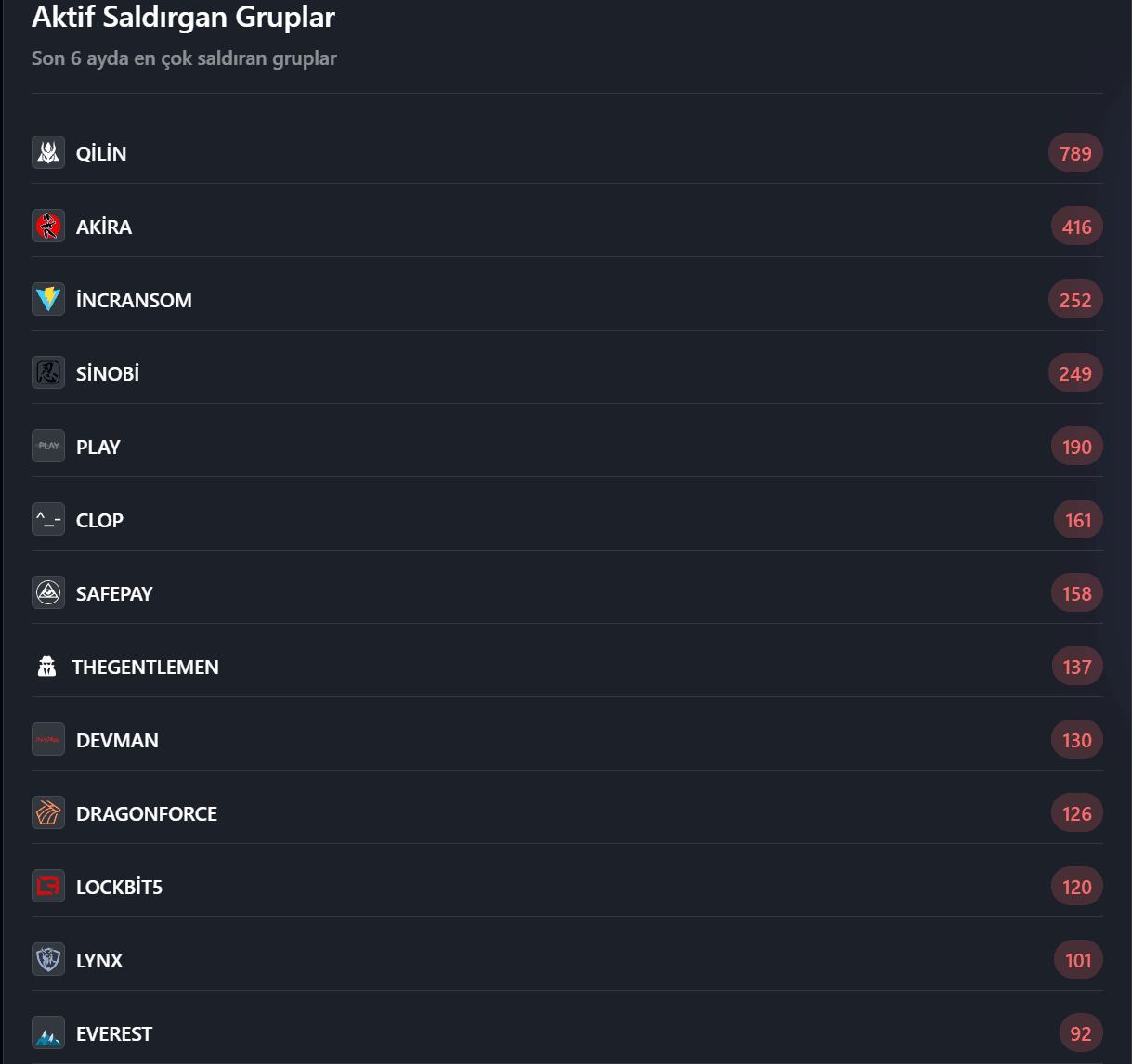 IncRansom (262), Sinobi (224), Play (178), SafePay (172), DragonForce (135) ve Clop (118) gibi gruplar da aktif olarak faaliyet göstermeye devam ediyor.